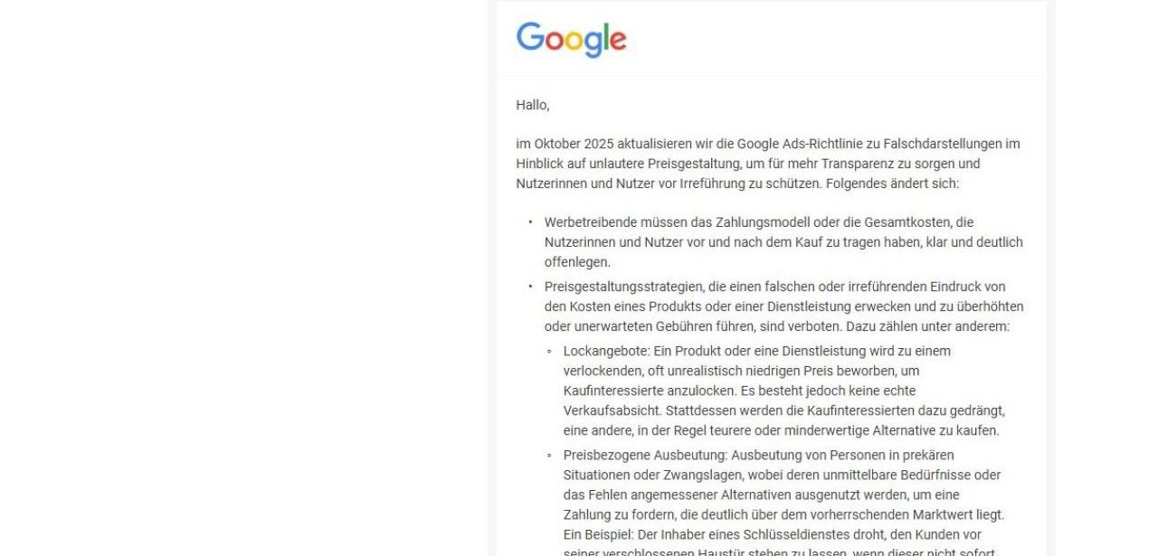 Werbetreibende im Onlinehandel wurden per globaler E-Mail über die kommende Aktualisierung der Google-Ads-Richtlinie zu irreführenden Preisangaben informiert. Ab Oktober 2025 müssen sämtliche Werbeanzeigen vollständige Informationen zu Basispreis, Steuern, Versand- und Zusatzkosten enthalten. Ecommerce-Unternehmen sollten ihre Preis- und Zahlungsmodelle überarbeiten, Preiserweiterungen aktualisieren und transparente Festpreistabellen bereitstellen. Die zeitnahe Umsetzung schützt vor Anzeigensperrungen, sichert die Einhaltung der neuen Vorgaben und fördert langfristig ein vertrauenswürdiges Einkaufserlebnis für Verbraucher und beugt Abmahnungen vor, wirksam.